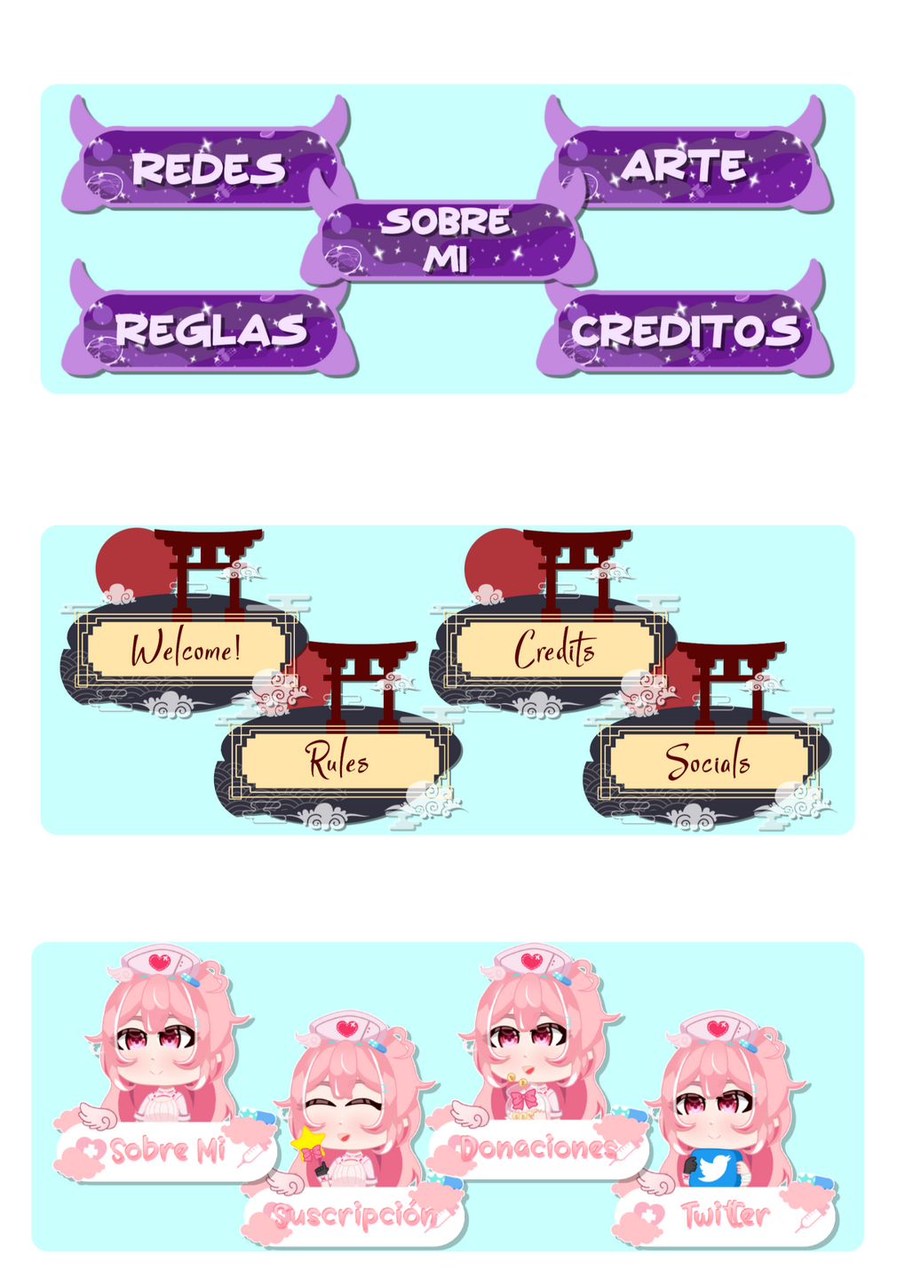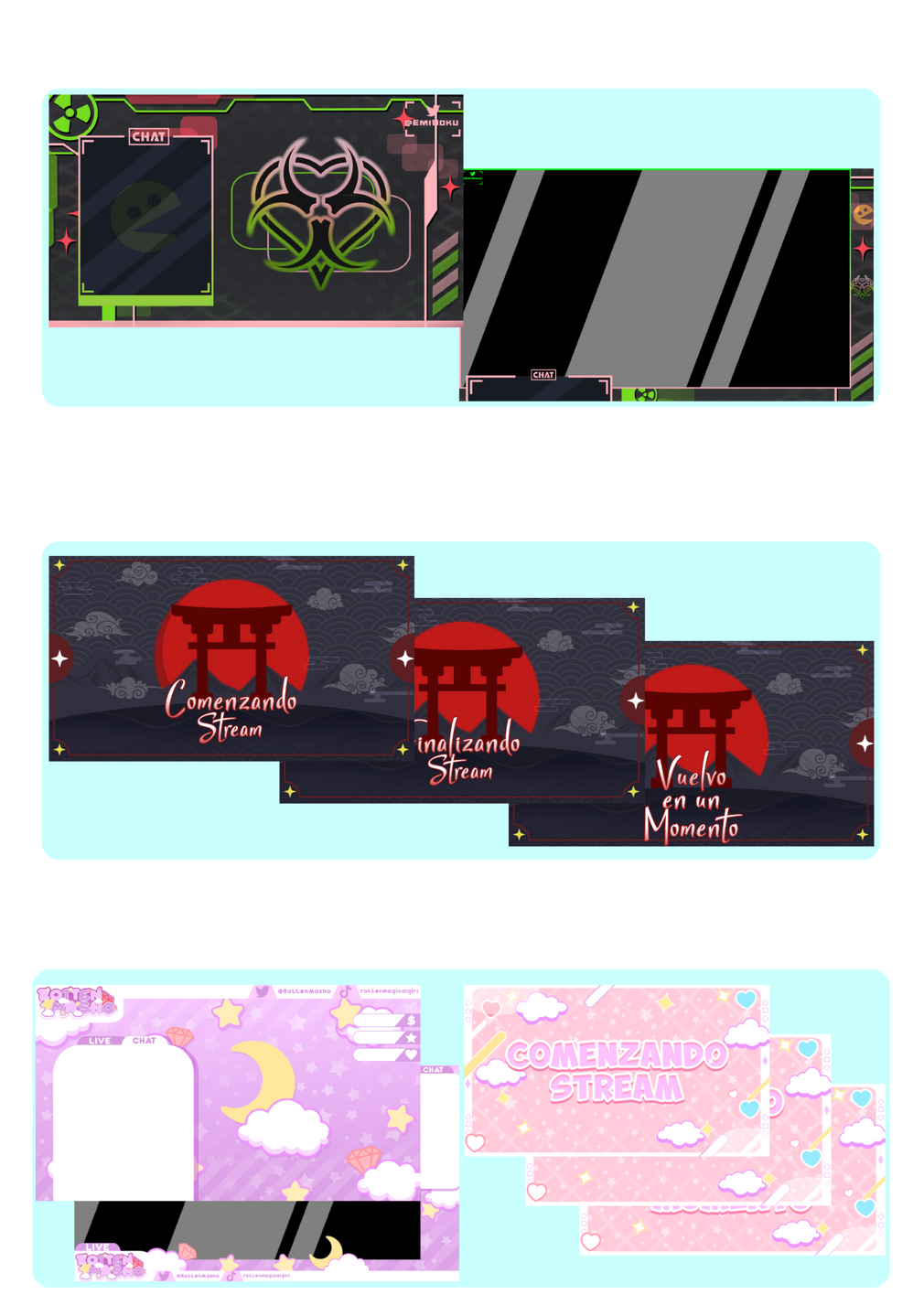 - 2 Overlays Stream x $16 USD- 3 Pantallas de Carga x $12 USD- Pack: 2 Overlays y 3 Pantallas de Carga x $24 USD